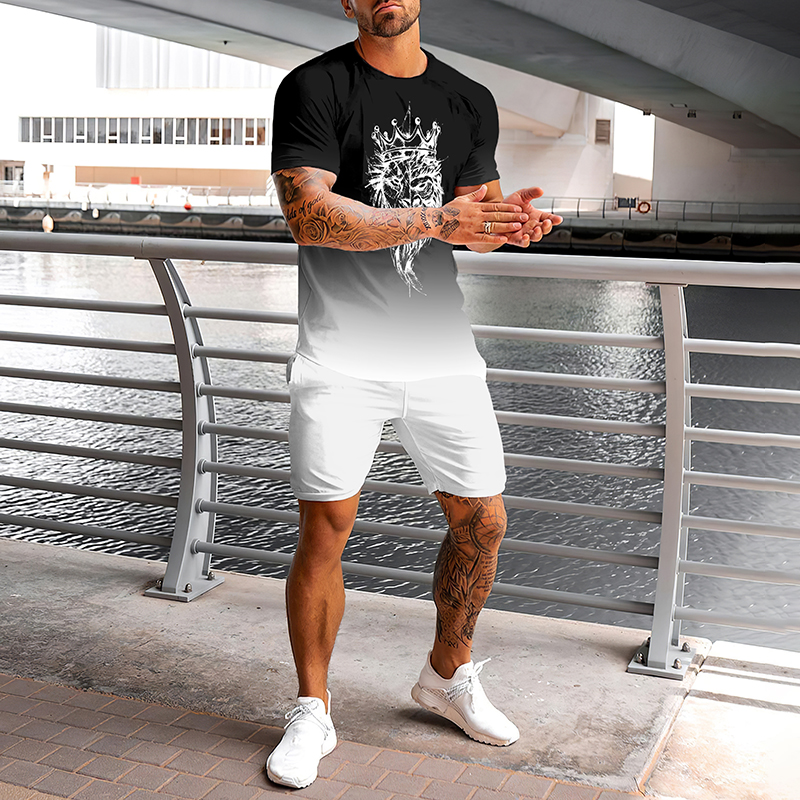 Black And White Gradient Print T-Shirt And Shorts Two-Piece Set