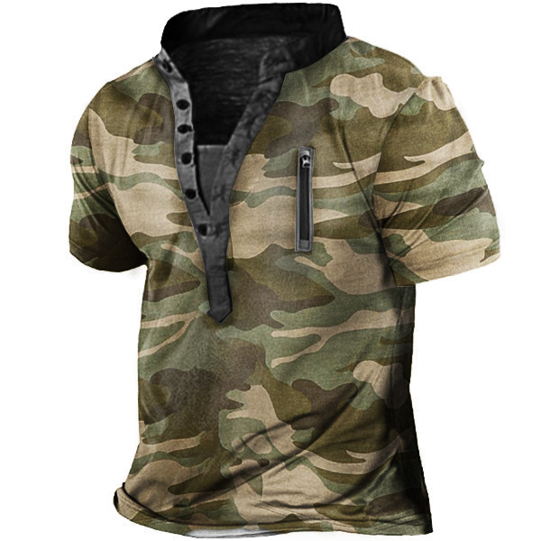 Camo Print Men's Vintage Henley Zip Pocket Tactical Henley Collar T-Shirt