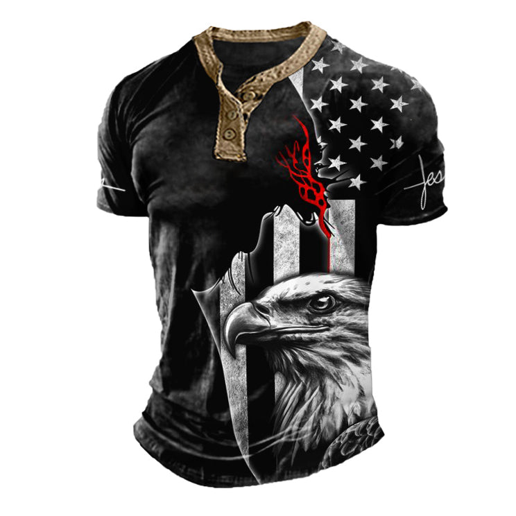Mens Legendary Jesus Eagle Print Henry Collar T-Shirt