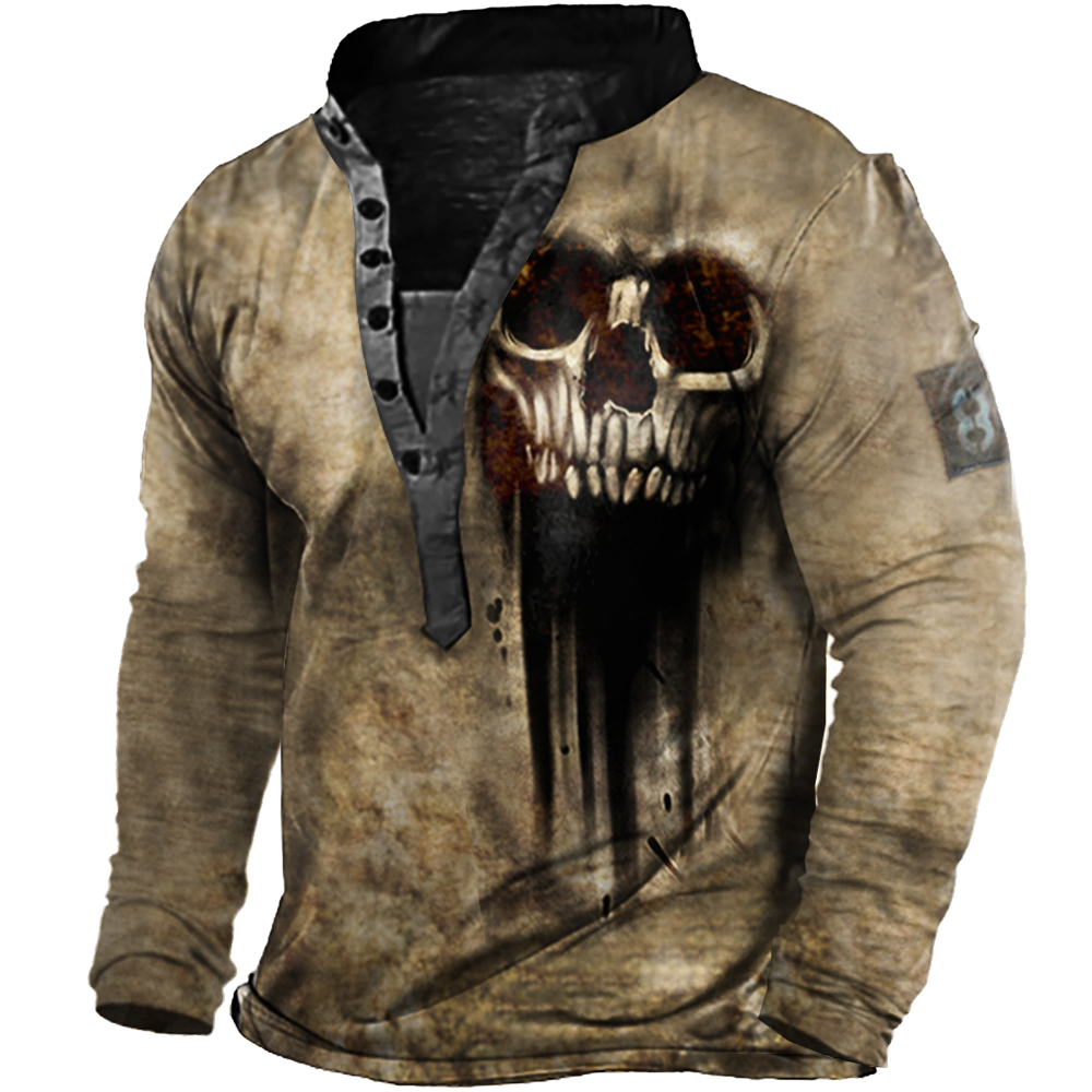 Men's Vintage Skull Print Henley Collar Long Sleeve T-Shirt